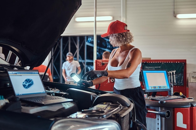 Expert mechanics diagnosing engine issues